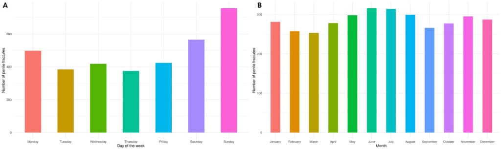 La mayoría de las fracturas de pene ocurrieron durante el fin de semana. El domingo concentró el 22% de los casos, seguido del sábado con un 17%. En conjunto, ambos días representaron el 39% del total de los eventos, con un riesgo un 58% mayor en comparación con los días hábiles.