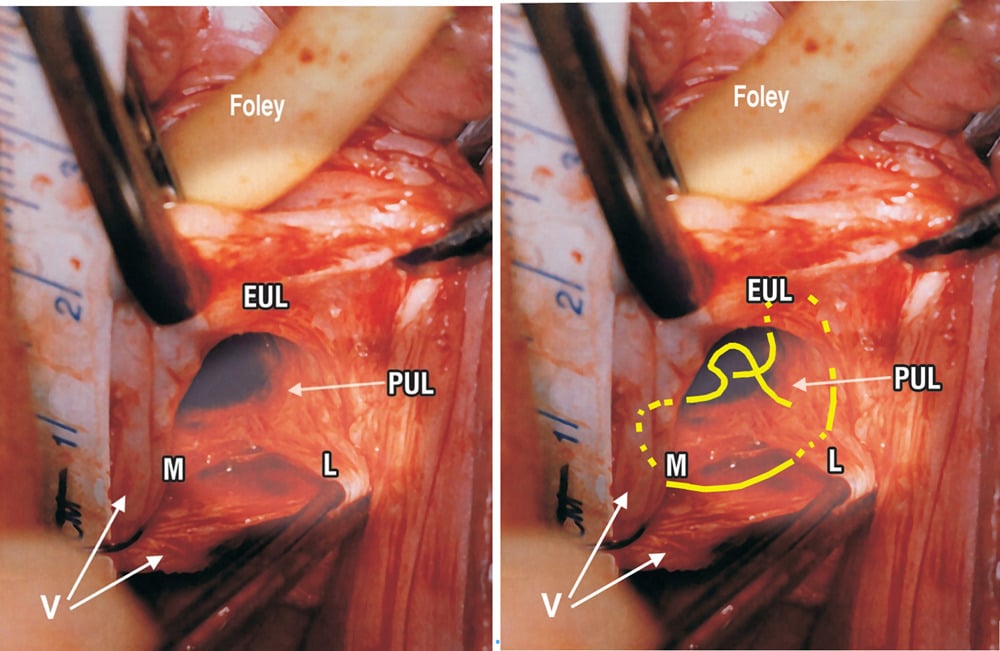Derecha: suturas de poliéster Nº 2 o preferentemente Nº 5 fijan ambas ramas del PUL a las fascias adheridas al hueso púbico, la uretra, la vagina y el músculo pubococcígeo (PCM), esencialmente como se realizaba en la técnica original.